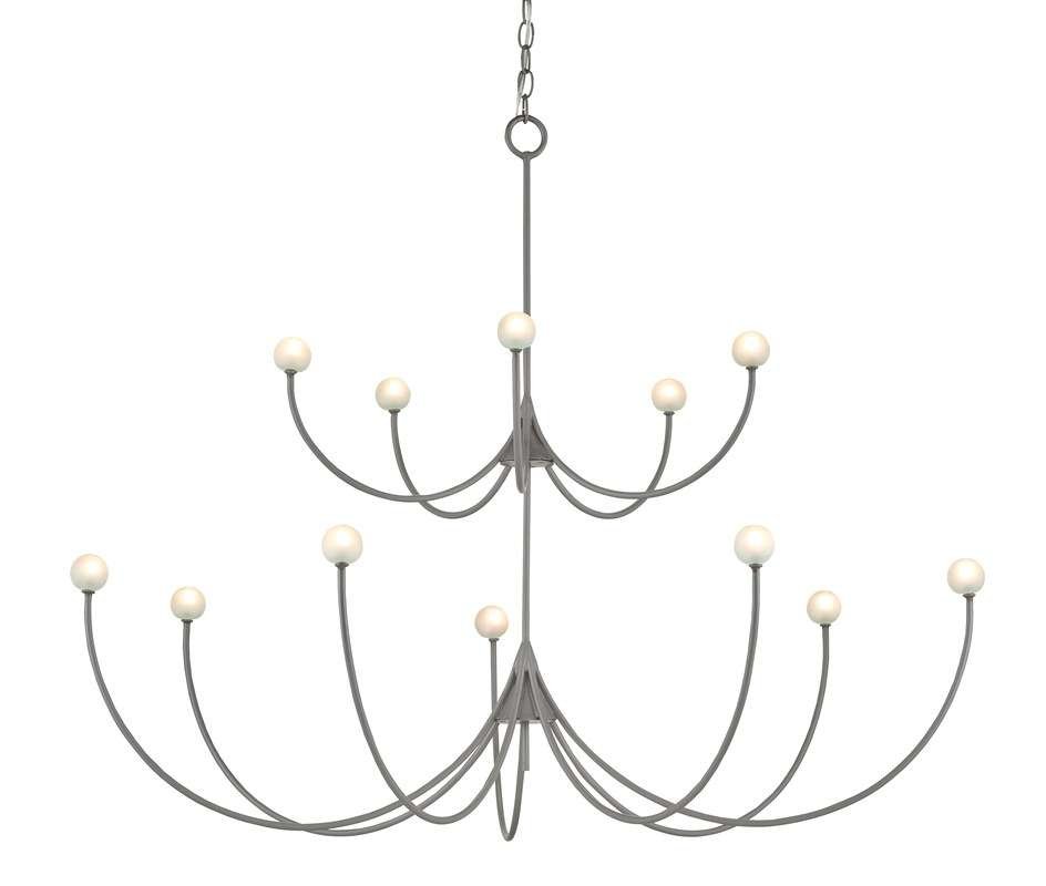 Taking a traditional chandelier shape and updating it with clean lines for a modern feel was the move our design team made with the Carew Medium Chandelier. The wrought iron in a Hiroshi Gray finish gives this gray chandelier an industrial feel. We also offer the Carew in small and large chandeliers.