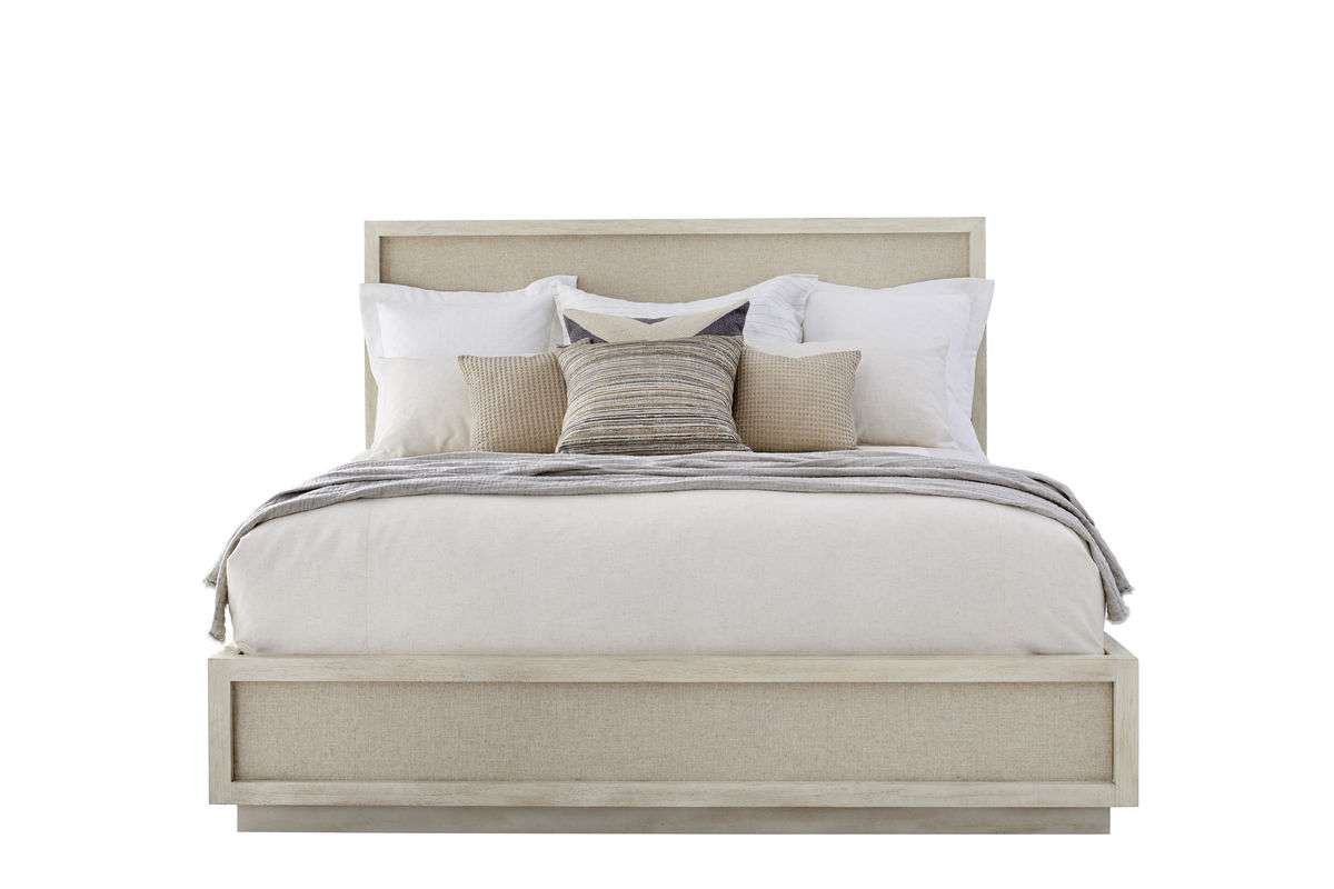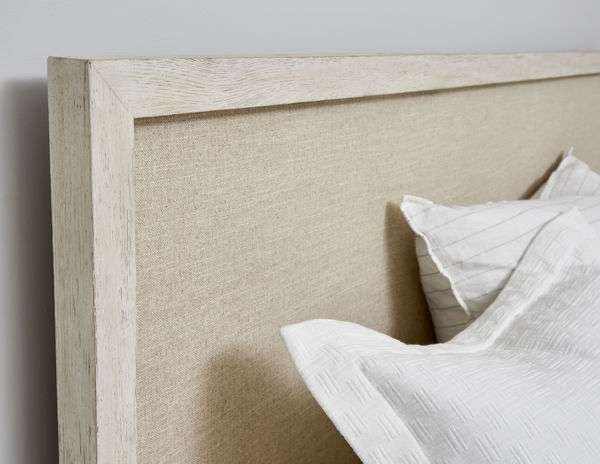 Form complements function beautifully in this modern panel bed, showcasing a solid base frame in a warm neutral finish highlighted by woven fabric upholstery. Reminiscent of strikingly geometric mid century architecture, the headboard and frame present vintage-inspired style with modern appeal.