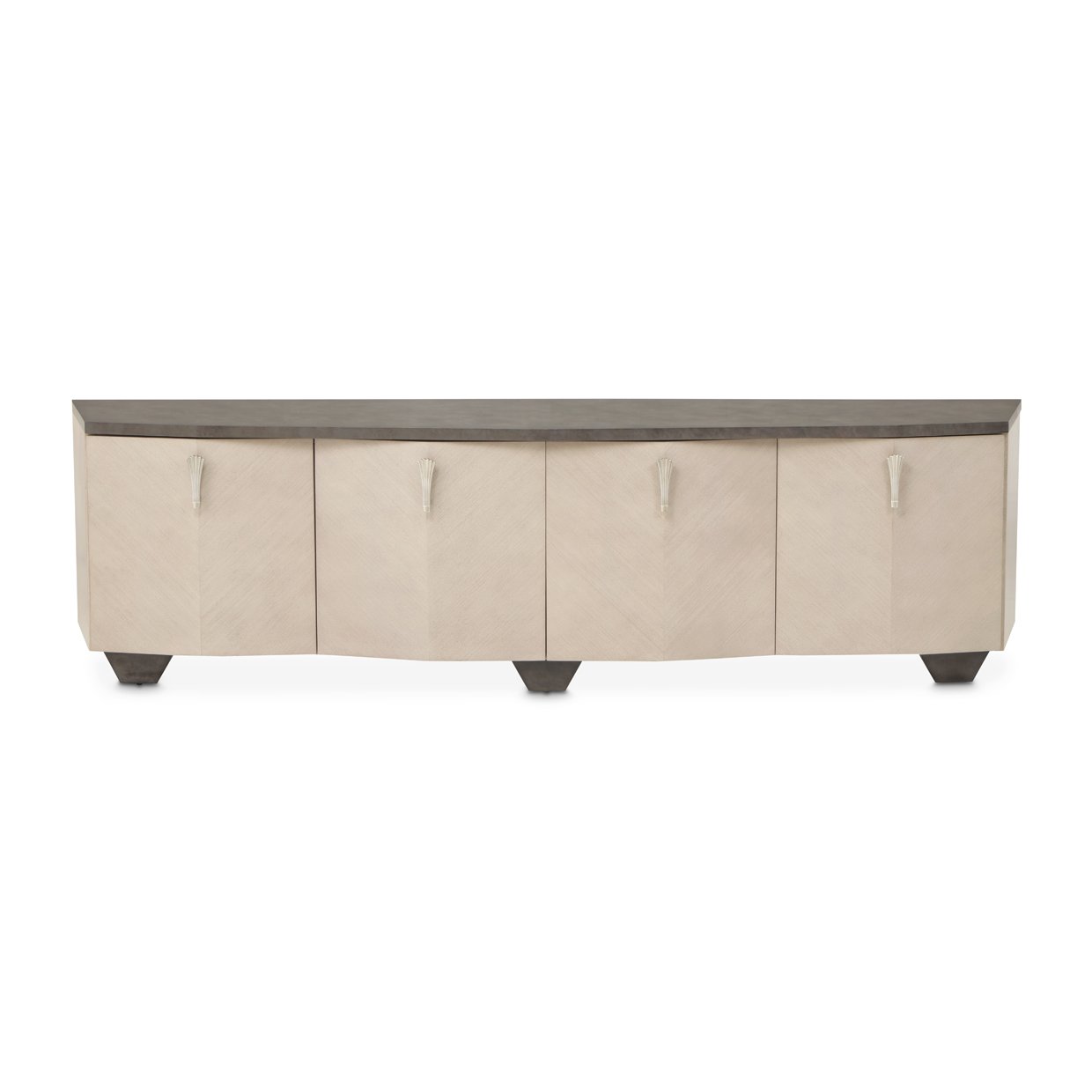 A vision of tailored elegance, the Fantosini Media Cabinet makes a statement in any refined living space. Its softly angled, architectural silhouette is wrapped in oak veneers and finished in a radiant silver mist, bringing a subtle shimmer to its sculpted lines. The contrasting top offers depth with a smooth, smoky tone that draws the eye. Inside, a combination of fixed and adjustable shelving offers versatile storage solutions, while the expansive surface is perfect for supporting televisions up to 88 inches or showcasing your luxe décor.