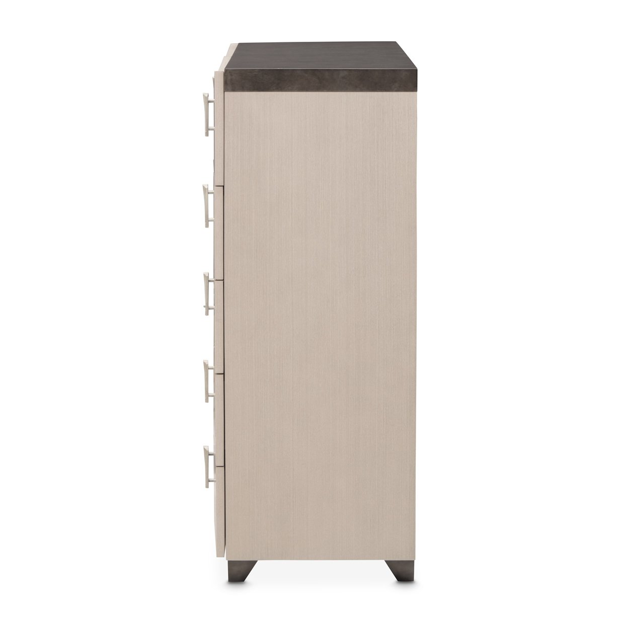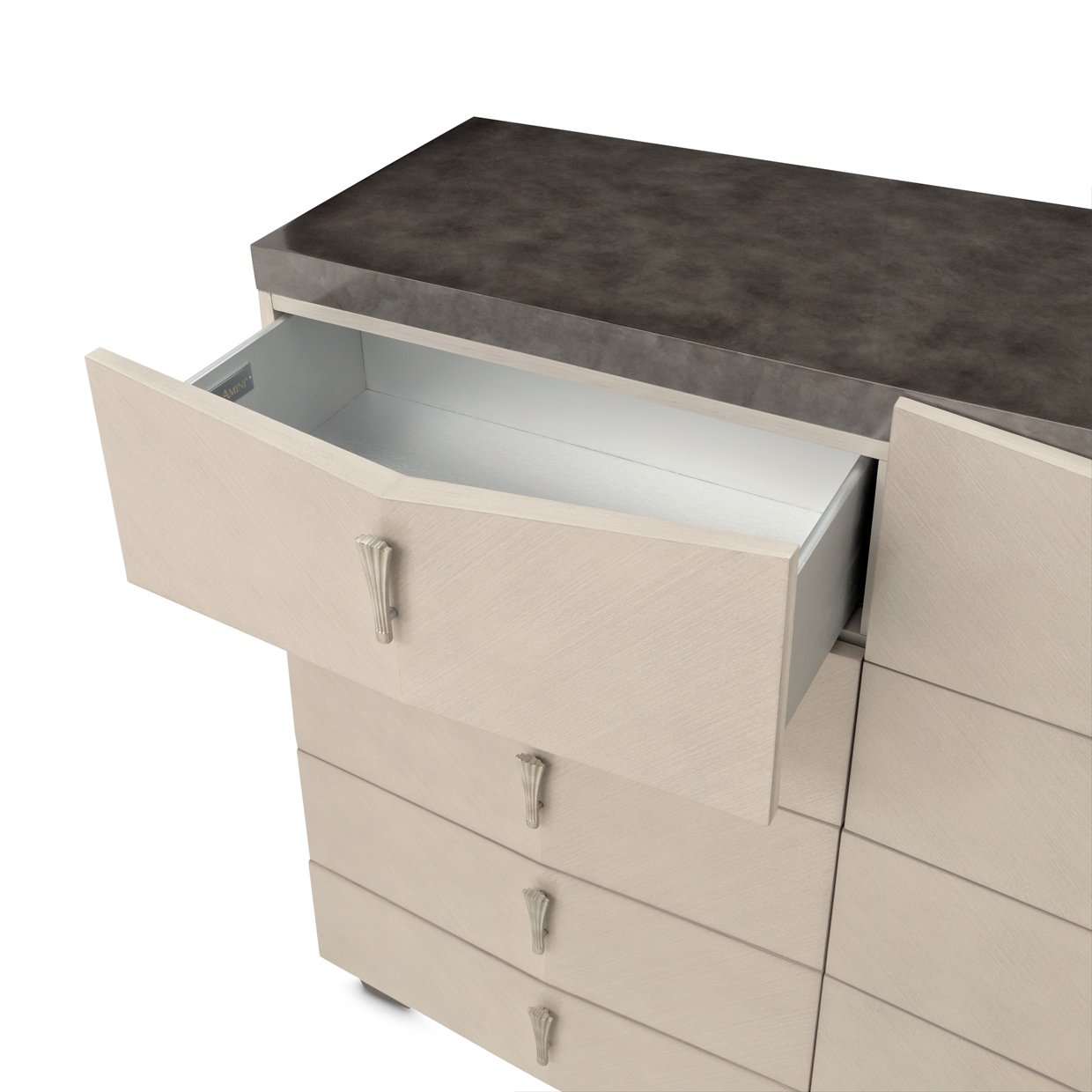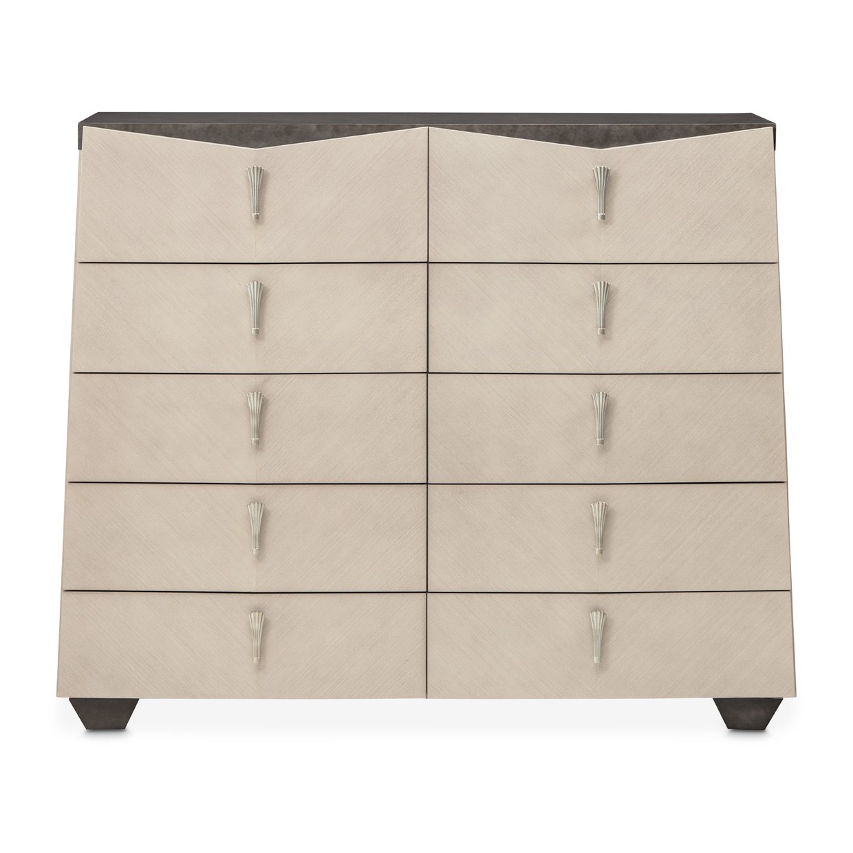 Striking in form and rich in detail, the Fantosini Chest offers a bold interpretation of modern luxury. Its sharply angled silhouette is clad in oak veneers with a soft silver mist finish, giving the piece a radiant, understated elegance. A contrasting top and tapered base introduce depth and dimension, while the fluted metallic hardware lends a graceful, sculptural quality. With ten soft-close drawers, this chest offers generous storage for garments and accessories, all while serving as a commanding focal point in the bedroom.