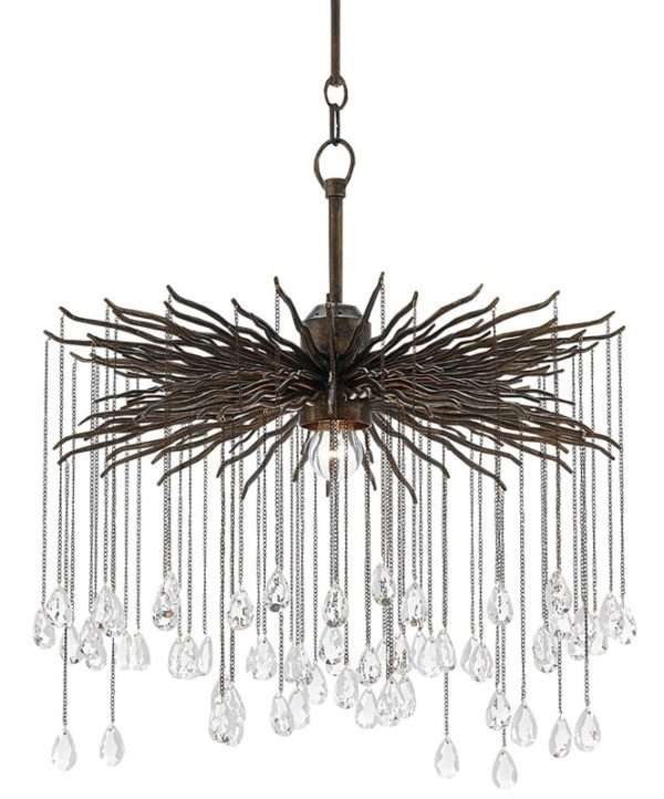 The Fen Small Chandelier is made of wrought iron limbs that stretch outward like gnarled branches. Each one supports a delicate chain adorned with a single crystal. The brutalist design of this bronze chandelier is heightened by the Cupertino finish. The Fen also comes in a larger version.