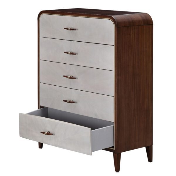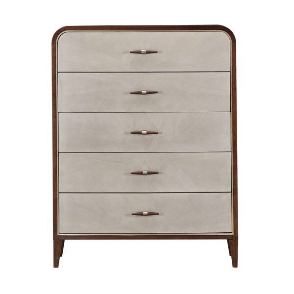 The Houston Chest combines contemporary refinement with effortless functionality. Its tall, elegant silhouette is framed in a warm walnut finish, beautifully contrasted by gray drawer fronts with a subtly textured starburst pattern. A delicate gold trim highlights the design, while sleek, tapered handles crafted from wood and metal add a modern touch. Five velvet-lined drawers with soft-close glides offer ample storage, while the spacious top provides the perfect surface for décor and personal accents.