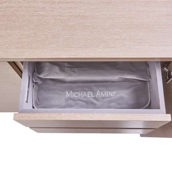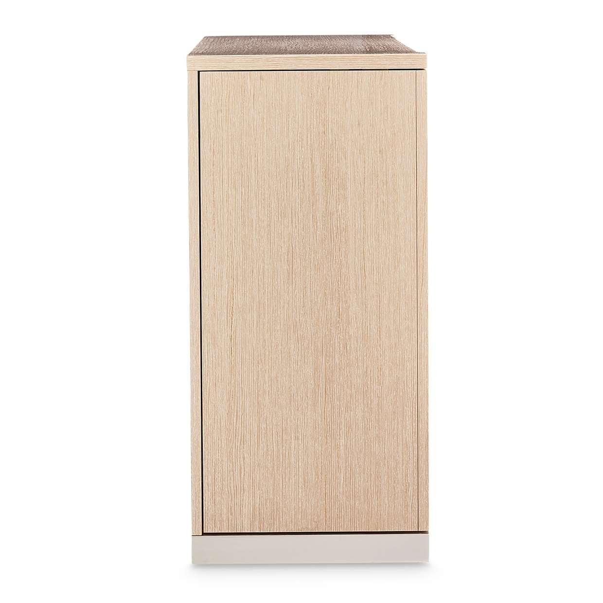 - Designed with Oak veneer, Washed Oak finish and Brushed Platinum accents