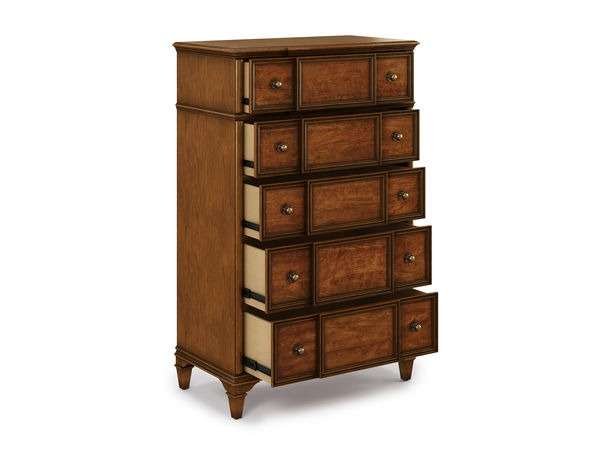 Beautifully constructed of warm-toned cherry wood, the lofty five drawer Newel Drawer Chest offers more than just storage space for wardrobe and accessories, it?s an eye-catching object of beauty and antique-inspired elegance. Featuring traditional paneling with subtle accent molding detail, each drawer is finished with oil rubbed bronze hardware, and lower drawers are lined in aromatic cedar.