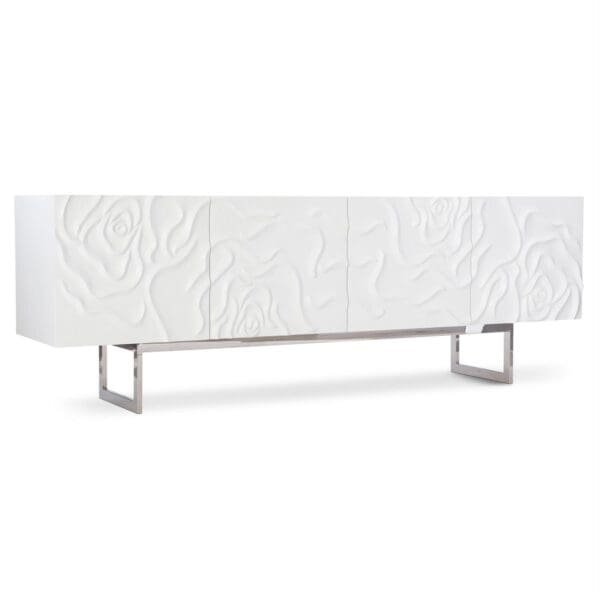 This stunning modern credenza makes an elegant statement with a floral pattern carved in white plaster.